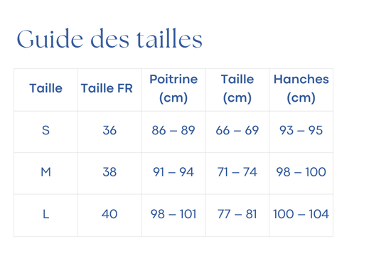 Pour trouver la taille qui vous correspond, prenez vos mensurations et consultez notre guide des tailles disponible sur chaque page de nos articles. Ce guide vous aidera à vous repérer facilement.